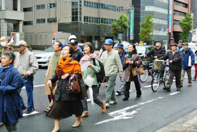 元安橋東詰めに移動していよいよ「アピールウォーク」の始まりです。コールは、新人の近松君が担当です。初々しい声で、はつらつとコールをリードします。ときどき言い間違えたかな、ということもなくはなかったけど、「愛嬌、愛嬌」といった感じで、みんながついていきます。中国電力本社に着くと、建物敷地のまわりをデモ行進で一周。約1時間をかけて、市役所東にある国泰寺公園で解散しました。