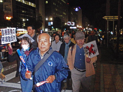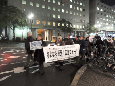 | 12月7日(金)のアピールウォーク参加者は60人余りでした。 寒い中、暗い中、しかも雨の中でした。 しかも、総選挙の真っ只中です。 そんな状況の中でも、60人を超える人たちが集まりました。 出発時点では、53人という報告でした。 行進中も、遅れてきた人、飛び入り(?)の参加がありました。 「寒くても雨でも続けるのがいいですね」 という感想もメールでいただいています。 原発をゼロにする最後の決断をするのは、政治です。 その政治を動かすのは、私たち市民の力であり、私たちの1票1票です。 あきらめず、粘り強く、学んで賢くなりながら、たたかい抜きましょう。 | ||